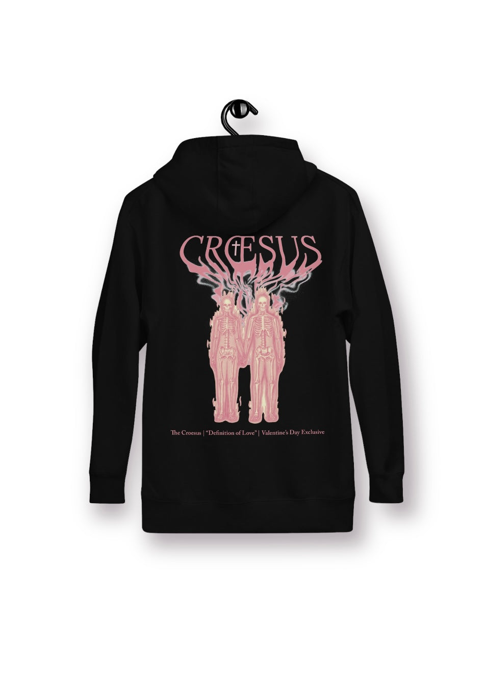 This black, screen-printed, pullover hoodie, is a cotton polyester blend with a streetwear fit. Screen-printed on the back is two flaming skeletons holding hands and on the front left chest is Croesus shaped in a heart.